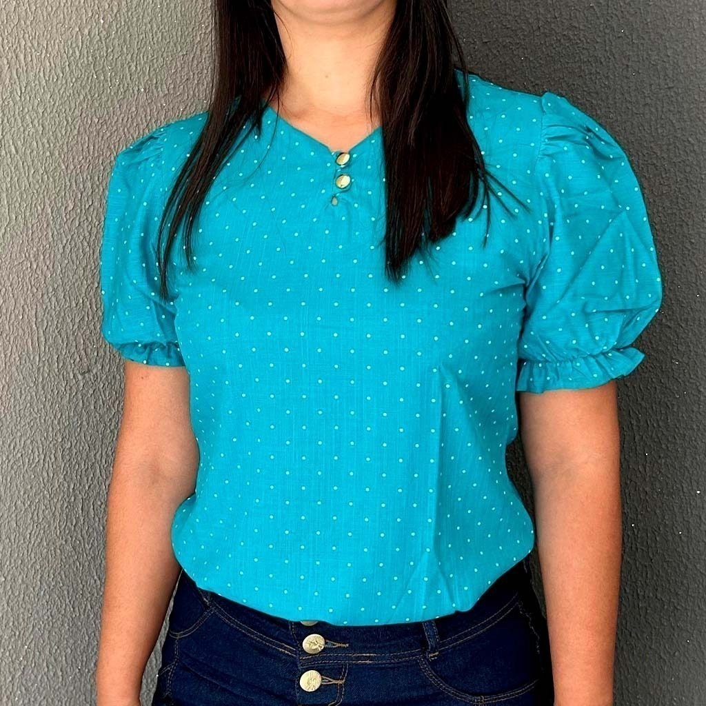 Destaques do Produto: - Material: Viscolinho leve e confortável - Cor: Azul claro suave que valoriza todos os tons de pele - Estampa: Bolinhas clássicas que nunca saem de moda - Versatilidade: Fácil de combinar com diferentes estilos e ocasiões
